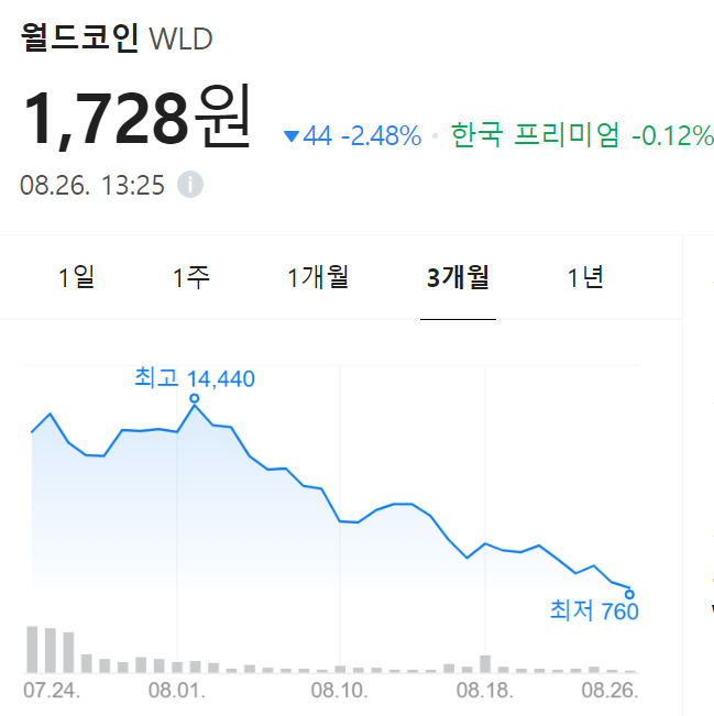 초기 높은 시세를 형성했던 월드코인은 고점 대비 약 12%까지 하락하고 있습니다